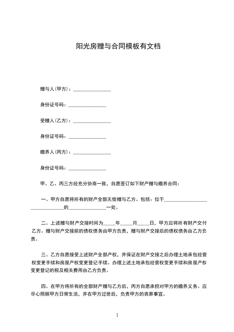 甲、乙、丙三方经充分协商一致,自愿签订如下财产赠与赡养合同: