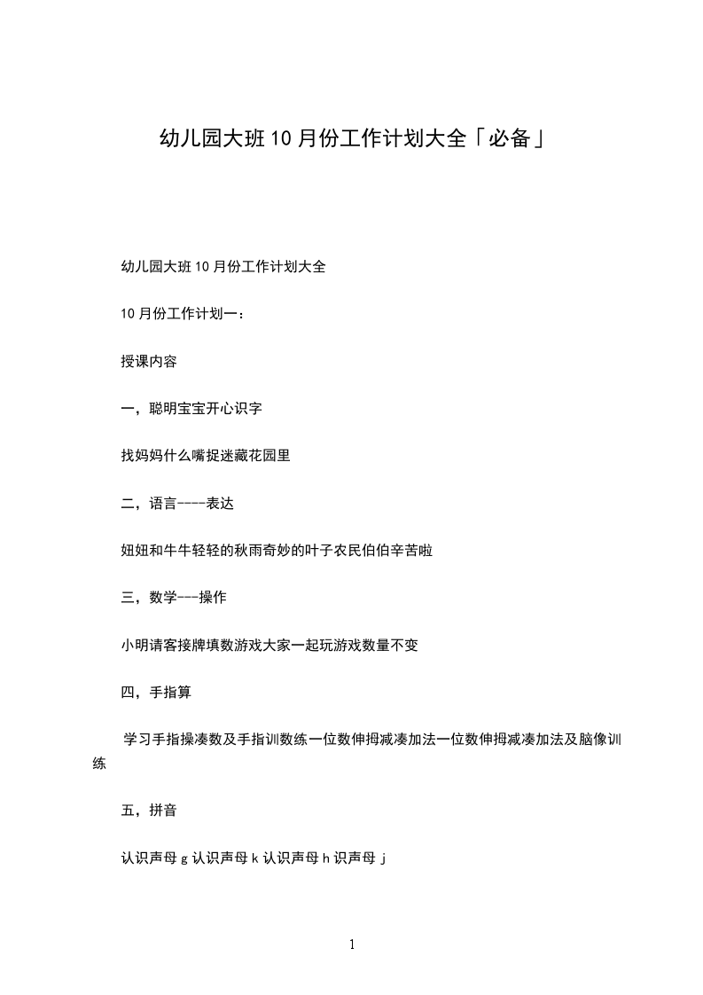 幼儿园大班10月份工作计划大全