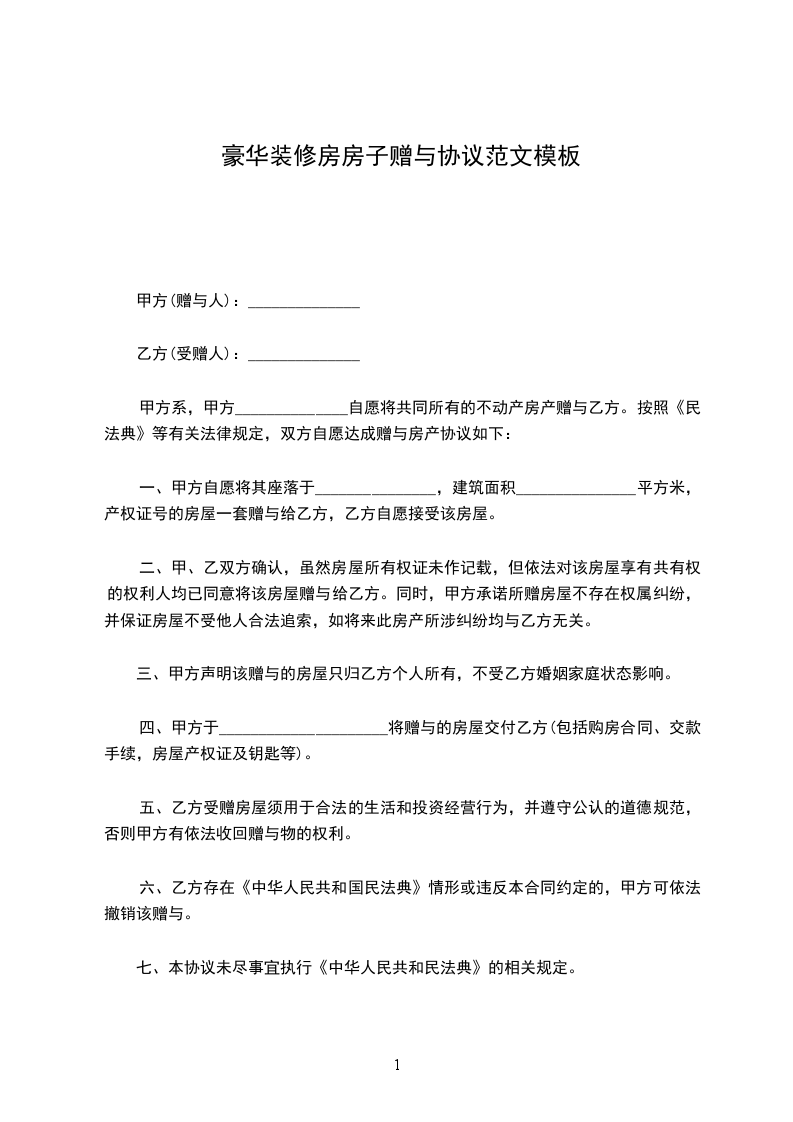 一、甲方自愿将其座落于_______________,建筑面积_______________平方米,产权证号的房屋一套赠与给乙方,乙方自愿接受该房屋。