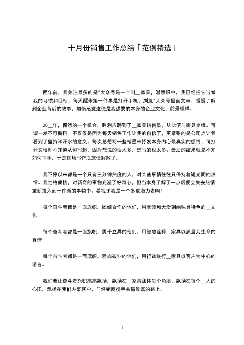 20__年,偶然的一个机会,胜利应聘到了__家具销售员,从此便与家具良缘。可谓一发不可摒挡。不仅仅是因为每天销售工作让我的自信了,更紧张的是公司点让我看到了坚持和汗水的意义。每次总想写一些翰墨来抒发本身内心最真实的感情,可打开文档却不知道从何写起,因为想说的话太多,想写的也太多。最后的结果就是不知如何下手,于是这场写作之旅便解散了。