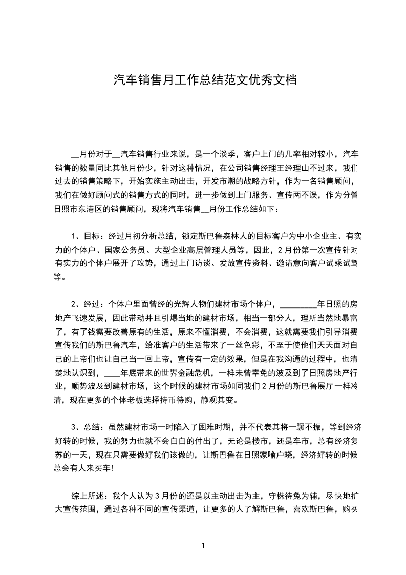 __月份对于__汽车销售行业来说,是一个淡季,客户上门的几率相对较小,汽车销售的数量同比其他月份少,针对这种情况,在公司销售经理王经理山不过来,我们过去的销售策略下,开始实施主动出击,开发市潮的战略方针,作为一名销售顾问,我们在做好顾问式的销售方式的同时,进一步做到上门服务、宣传两不误,作为分管日照市东港区的销售顾问,现将汽车销售__月份工作总结如下: