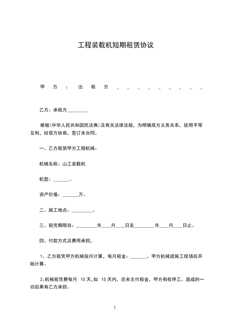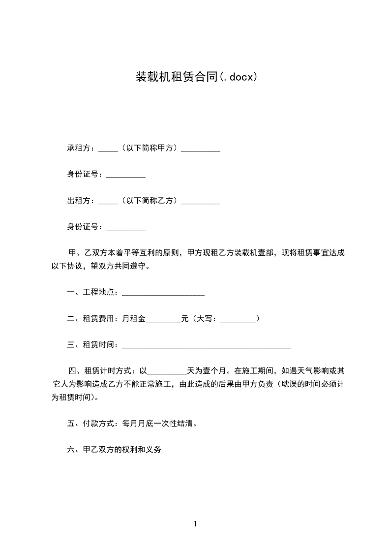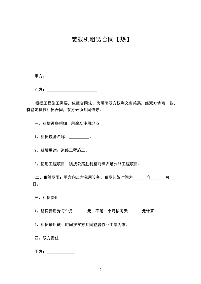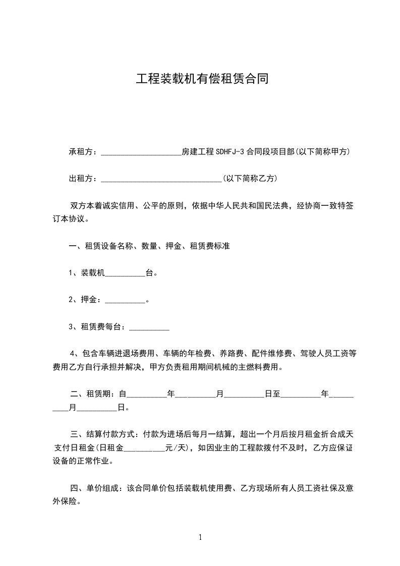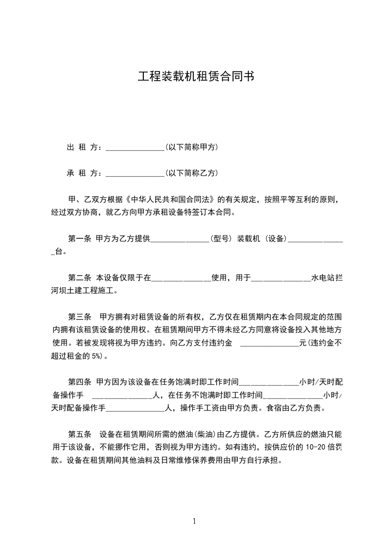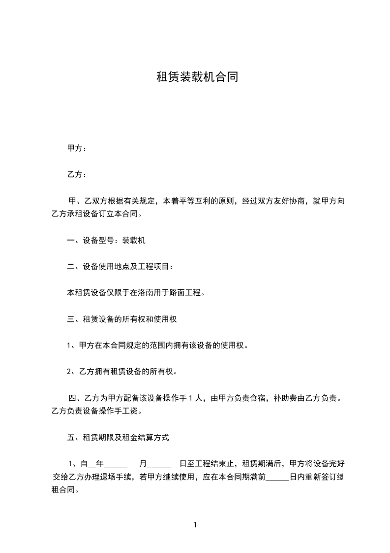 第一条 甲方为乙方提供_______________(型号) 装载机 (设备)_______________台。