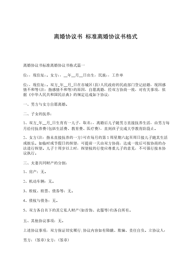 以上二协议人于______年______月______日在______人民政府办理结婚登记手续。婚后于______年______月______日生育一儿子,取名______,现已参加工作。二协议人在婚后共同生活中性格不合,无共同语言、爱好,现无法共同生活,夫妻感情确已破裂,又无和好可能,二协议人经慎重考虑,自愿达成如下离婚协议: