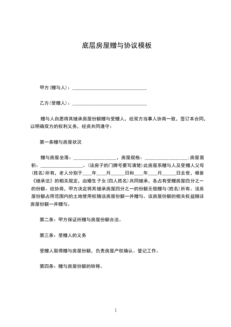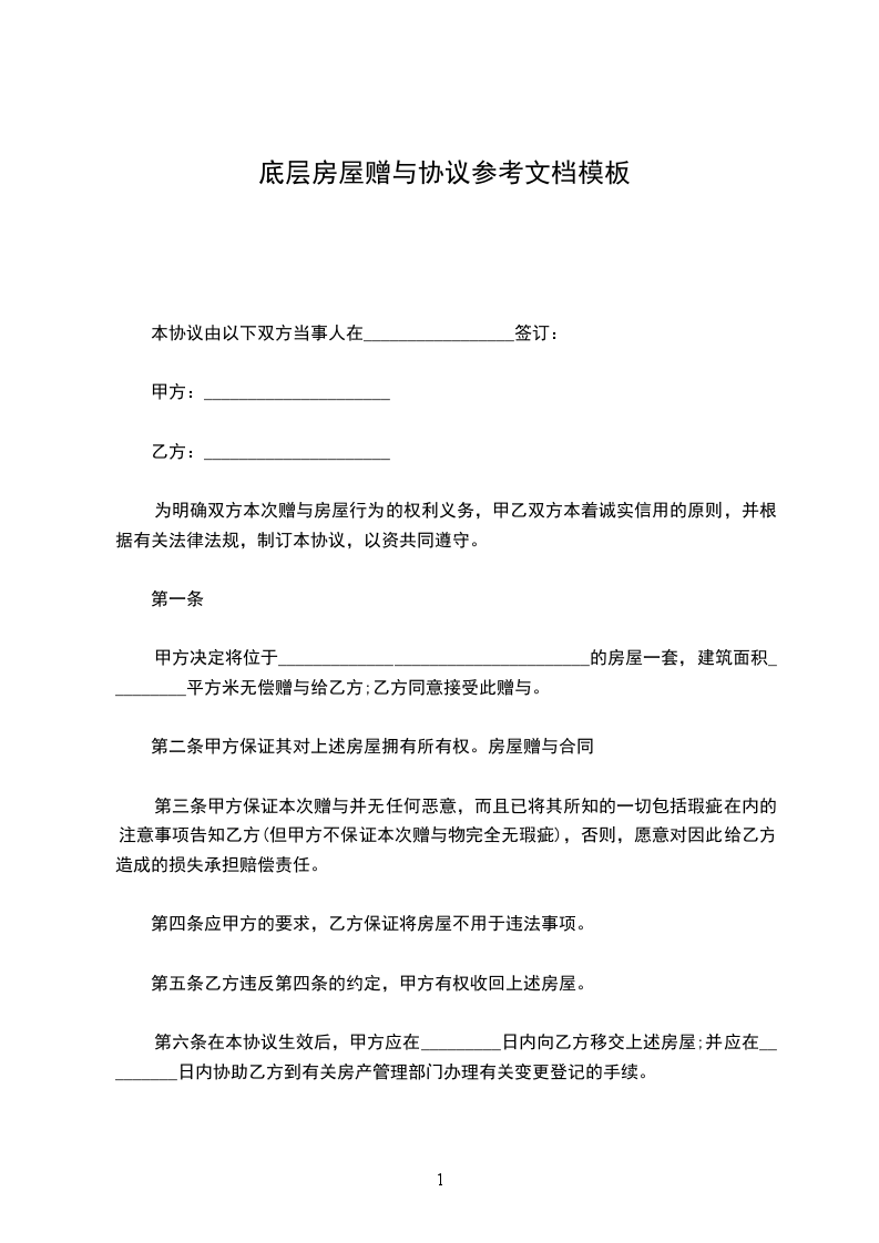 甲方决定将位于___________________________________的房屋一套,建筑面积_________平方米无偿赠与给乙方;乙方同意接受此赠与。