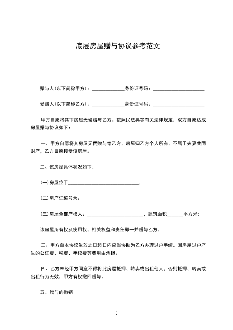 甲方自愿将其下房屋无偿赠与乙方。按照民法典等有关法律规定,双方自愿达成房屋赠与协议如下: