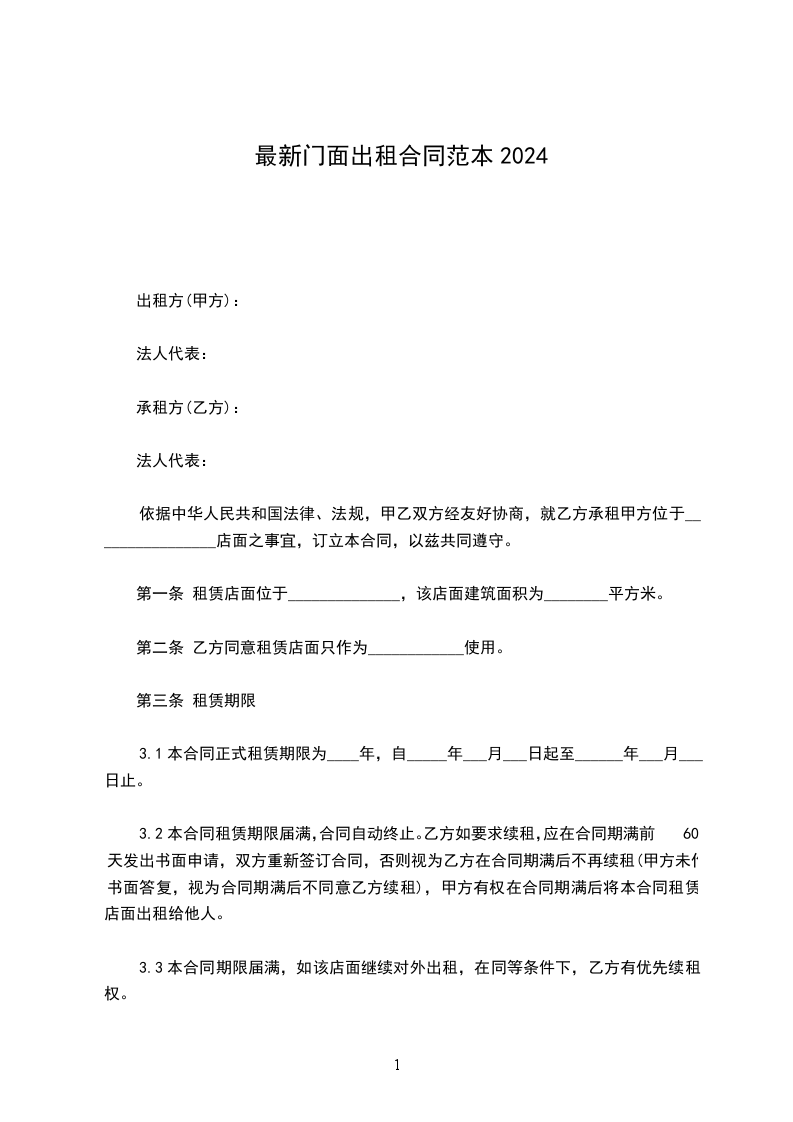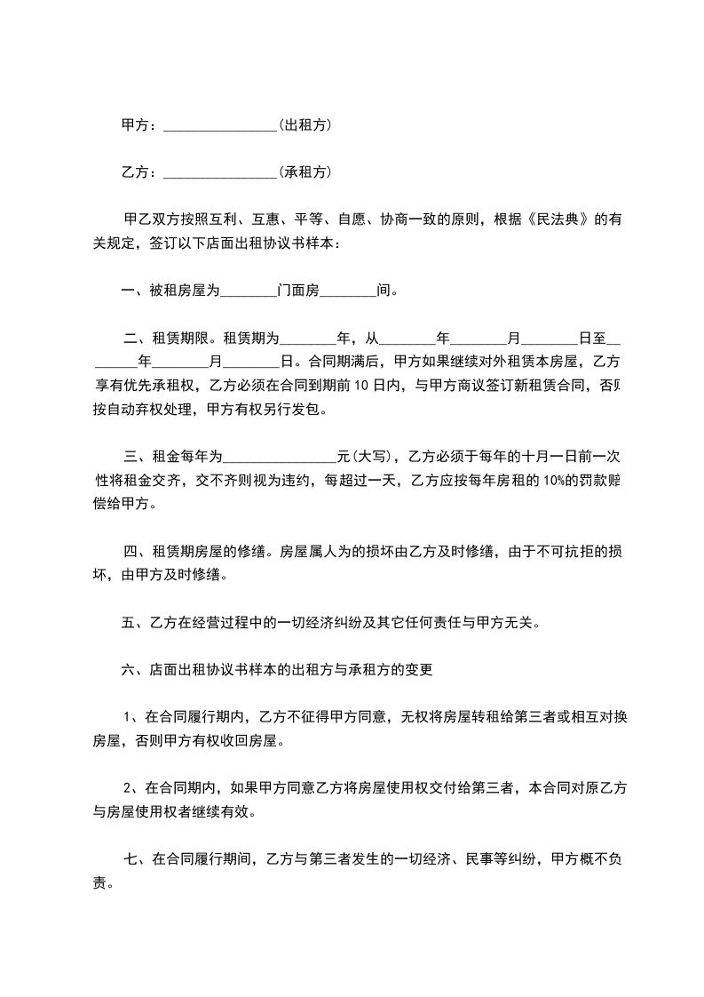 甲方将座落于县城_________一间面积为_________平方米的临街门面租赁给乙方,作_________使用。