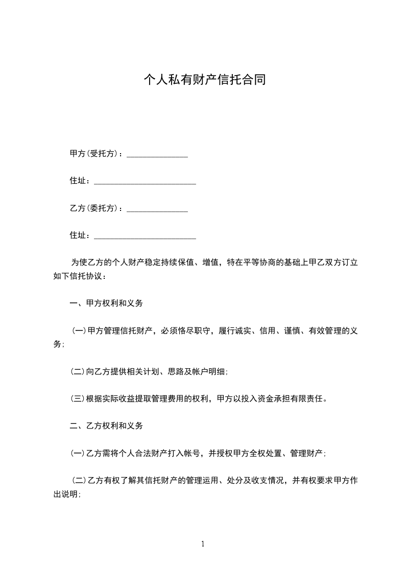 为使乙方的个人财产稳定持续保值、增值,特在平等协商的基础上甲乙双方订立如下信托协议: