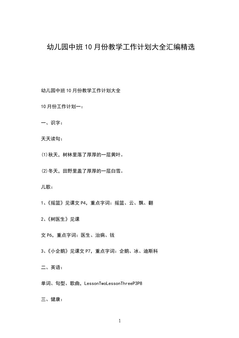 幼儿园中班10月份教学工作计划大全