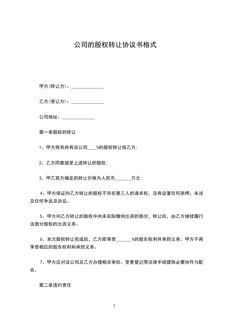 1、甲方将其持有该公司____%的股权转让给乙方;