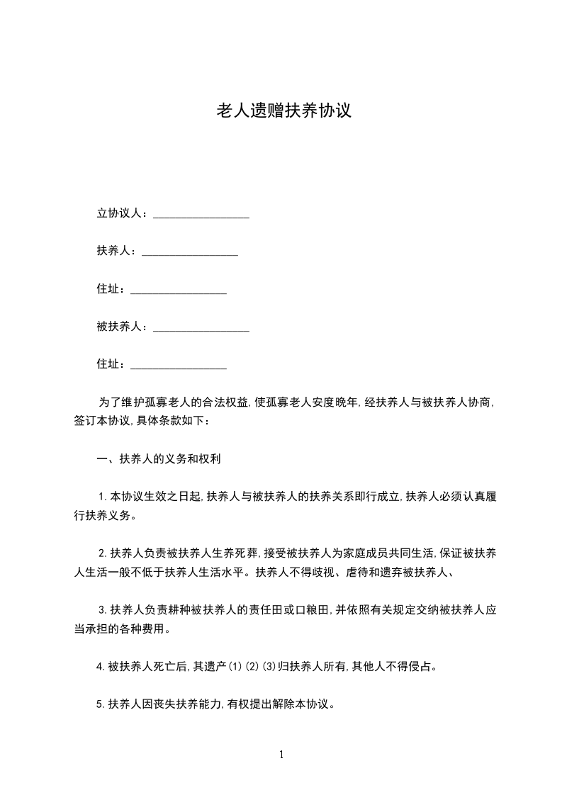 因年老,患等病,身体衰弱。家中无人照料,长期以来依靠照顾。经双方邀约,愿意签订遗赠扶养协议,并请作证,双方承诺履行以下协议:
