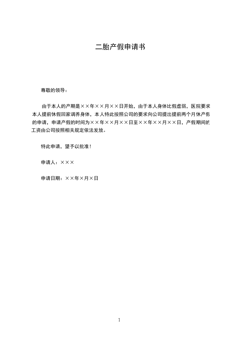 由于本人的产期是××年××月××日开始,由于本人身体比假虚弱,医院要求本人提前休假回家调养身体,本人特此按照公司的要求向公司提出提前两个月休产假的申请,申请产假的时间为××年××月××日至××年××月××日,产假期间的工资由公司按照相关规定依法发放。