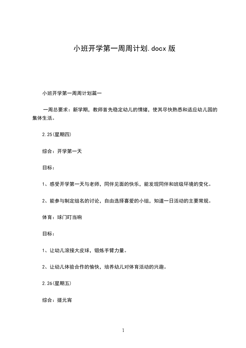小班开学第一周周计划篇二