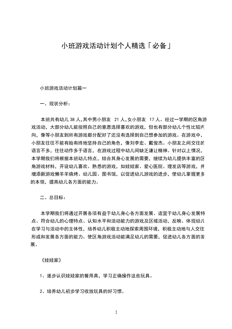 小班游戏活动计划篇一
