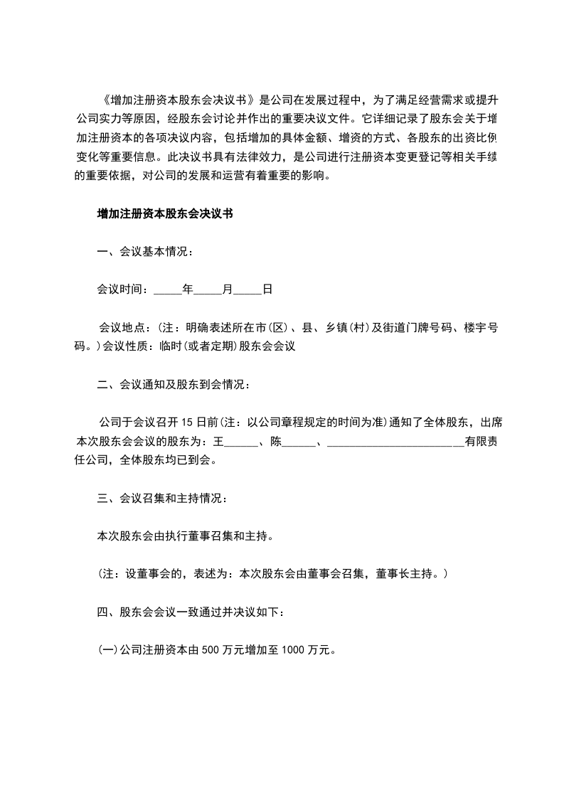 注册资金增加股东决议书最新的范文