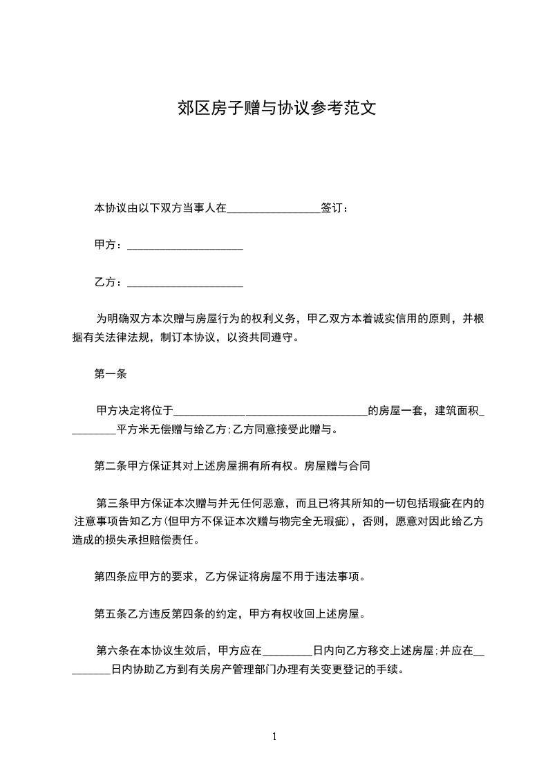 甲方决定将位于___________________________________的房屋一套,建筑面积_________平方米无偿赠与给乙方;乙方同意接受此赠与。