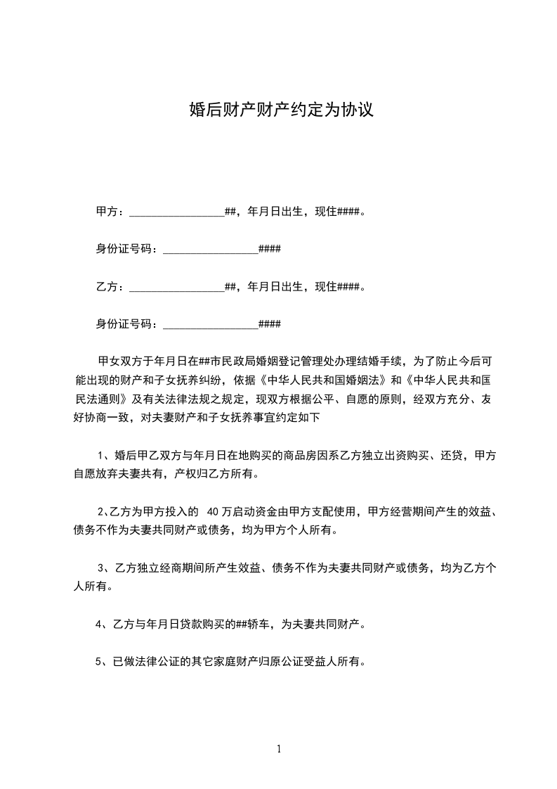 1、婚后甲乙双方与 年 月 日在 地购买的商品房因系乙方独立出资购买、还贷,甲方自愿放弃夫妻共有,产权归乙方所有。