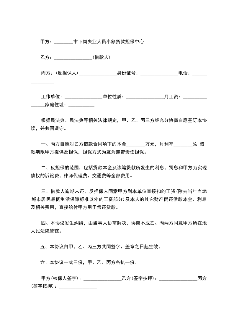 一、丙方自愿对乙方借款合同项下的本金________万元,月利率________‰,借款期限甲方提供反担保,担保方式为互为连带责任担保。