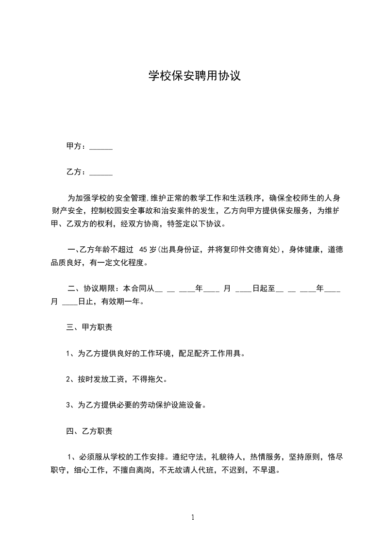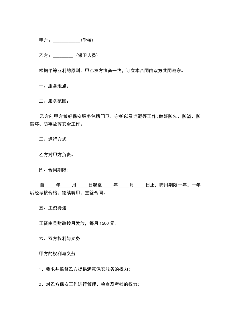3、乙方必须认真维护正常的工作秩序,防范行事、治安案件的发生,制止外来人员引发的各类纠纷和打架斗殴等违法犯罪行为,对现场发生的违法犯罪人员及时报警和抓获,扭送当地公安派出所处理,对学生的打架、斗殴行为进行劝阻,制止并及时报告学校;六、本合同有效期一年,一式四份,甲方签字盖章、乙方签字按手印从鉴订之日生效。甲、乙双方各执一份,送教育局和公安分局各一份,四份合同均有同等效力。