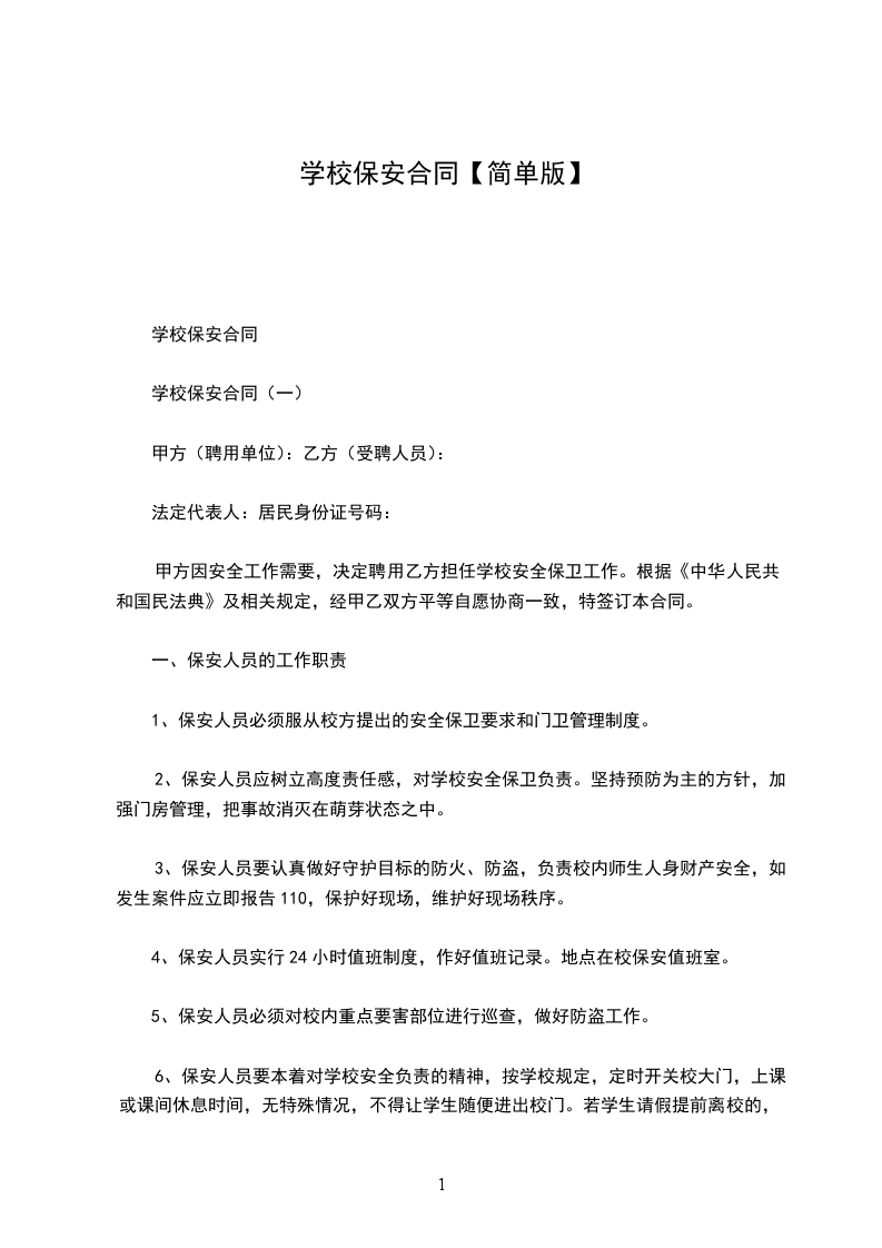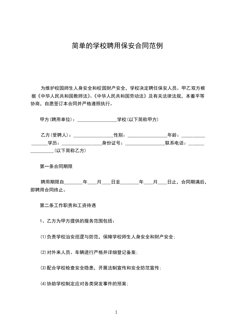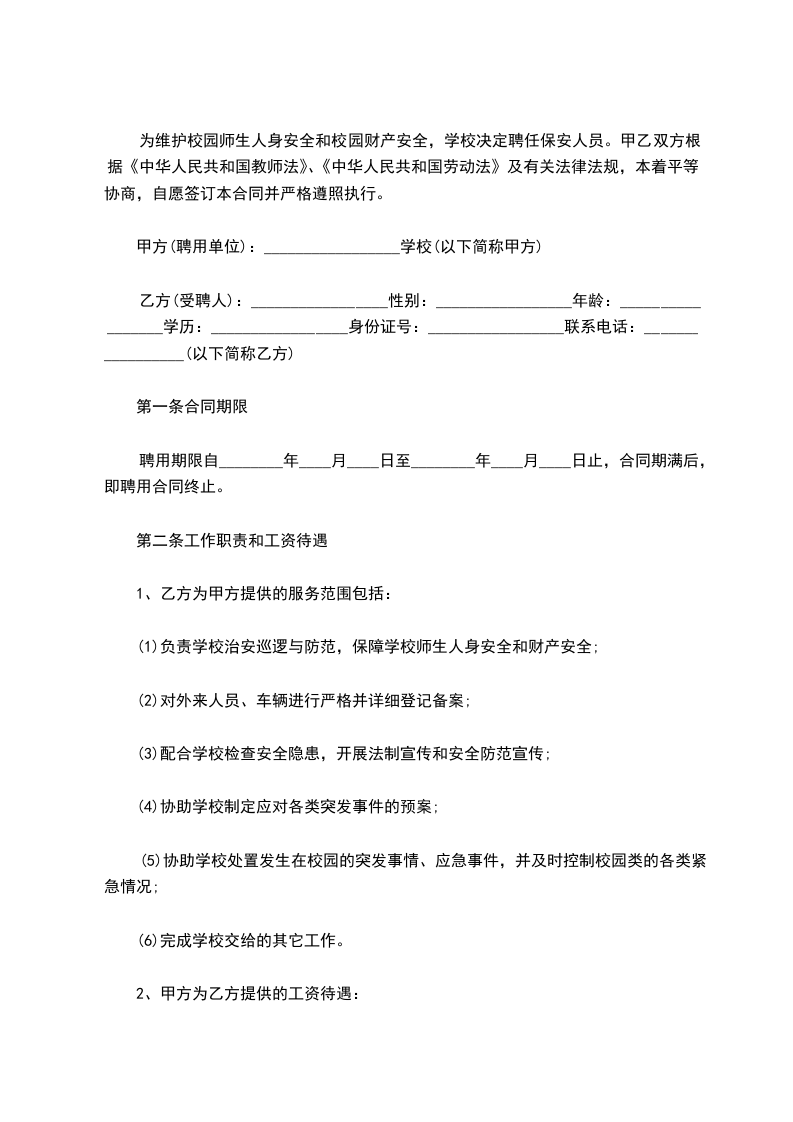 为维护校园师生人身安全和校园财产安全,学校决定聘任保安人员。甲乙双方根据《中华人民共和国教师法》、《中华人民共和国劳动法》及有关法律法规,本着平等协商,自愿签订本合同并严格遵照执行。