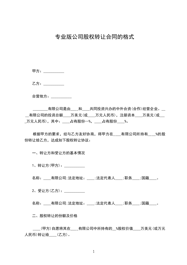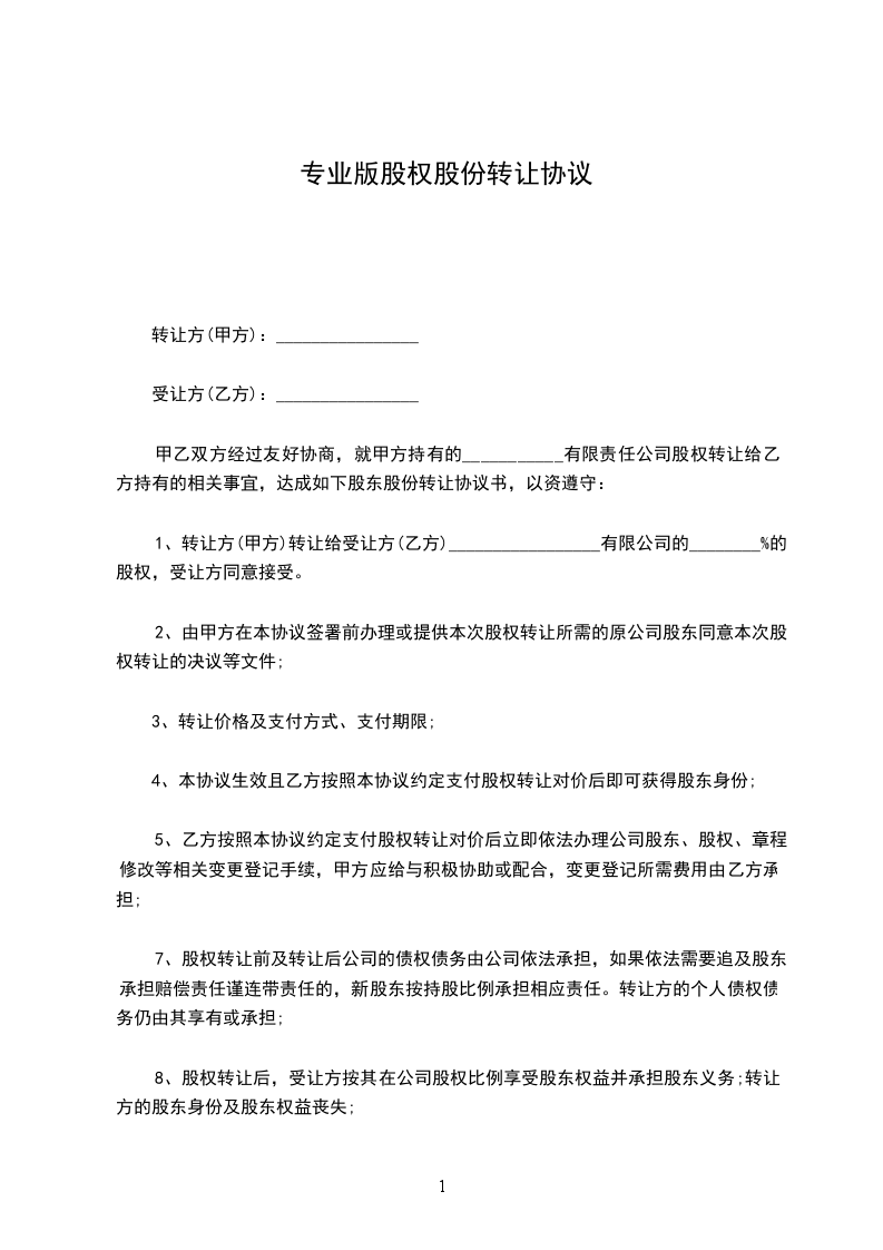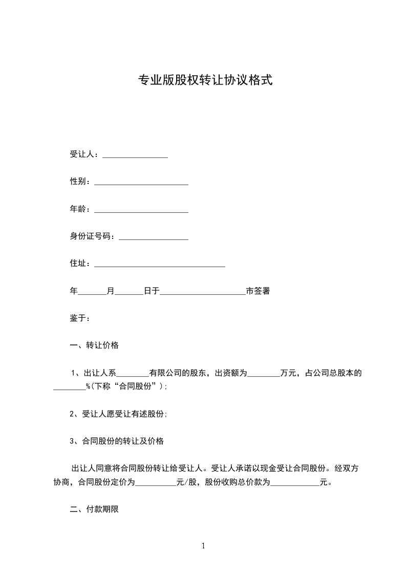 1、出让人系________有限公司的股东,出资额为________万元,占公司总股本的________%(下称“合同股份”);