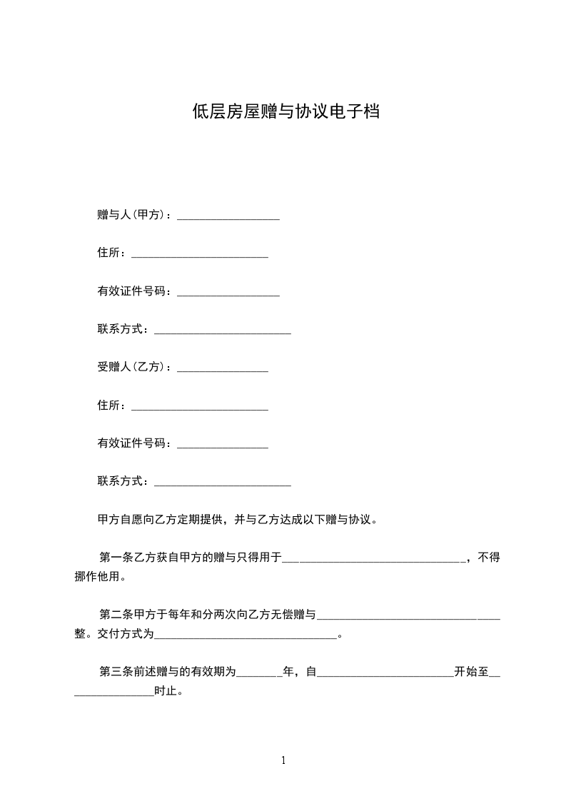 一、甲方自愿将其座落于_______________,建筑面积_______________平方米,产权证号的房屋一套赠与给乙方,乙方自愿接受该房屋。