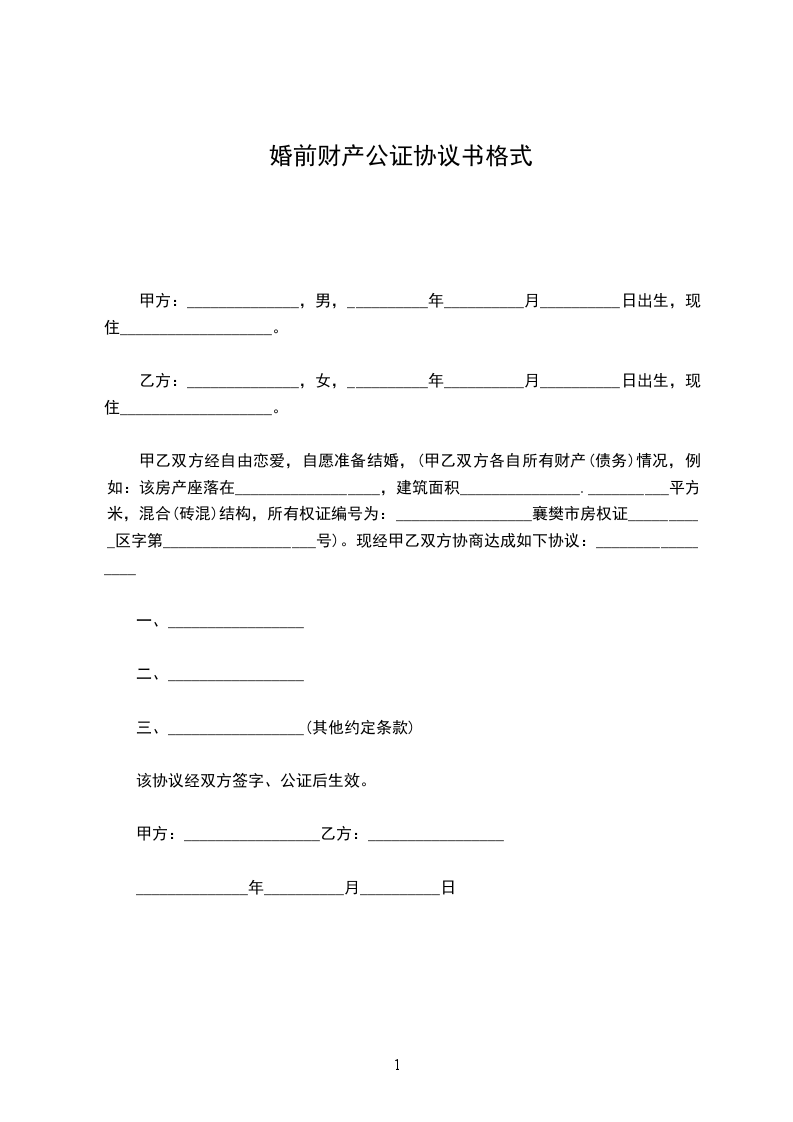 甲乙双方经自由恋爱,自愿准备结婚,(甲乙双方各自所有财产(债务)情况,例如:该房产座落在__________________,建筑面积_______________.__________平方米,混合(砖混)结构,所有权证编号为:_________________襄樊市房权证__________区字第___________________号)。现经甲乙双方协商达成如下协议:_________________