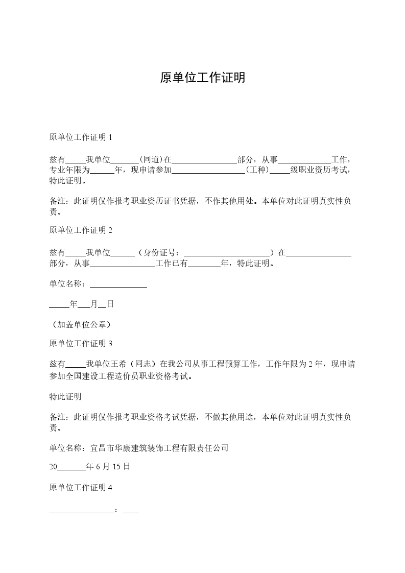 原单位工作证明3兹有_____我单位王希(同志)在我公司从事工程预算工作,工作年限为2年,现申请参加全国建设工程造价员职业资格考试。