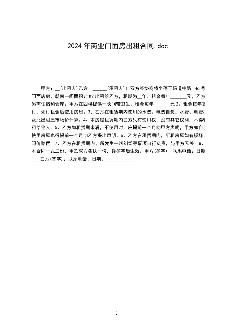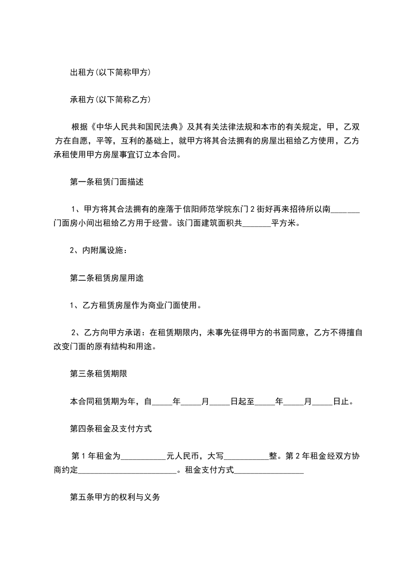 1、甲方将其合法拥有的座落于信阳师范学院东门2街好再来招待所以南_______门面房小间出租给乙方用于经营。该门面建筑面积共_______平方米。