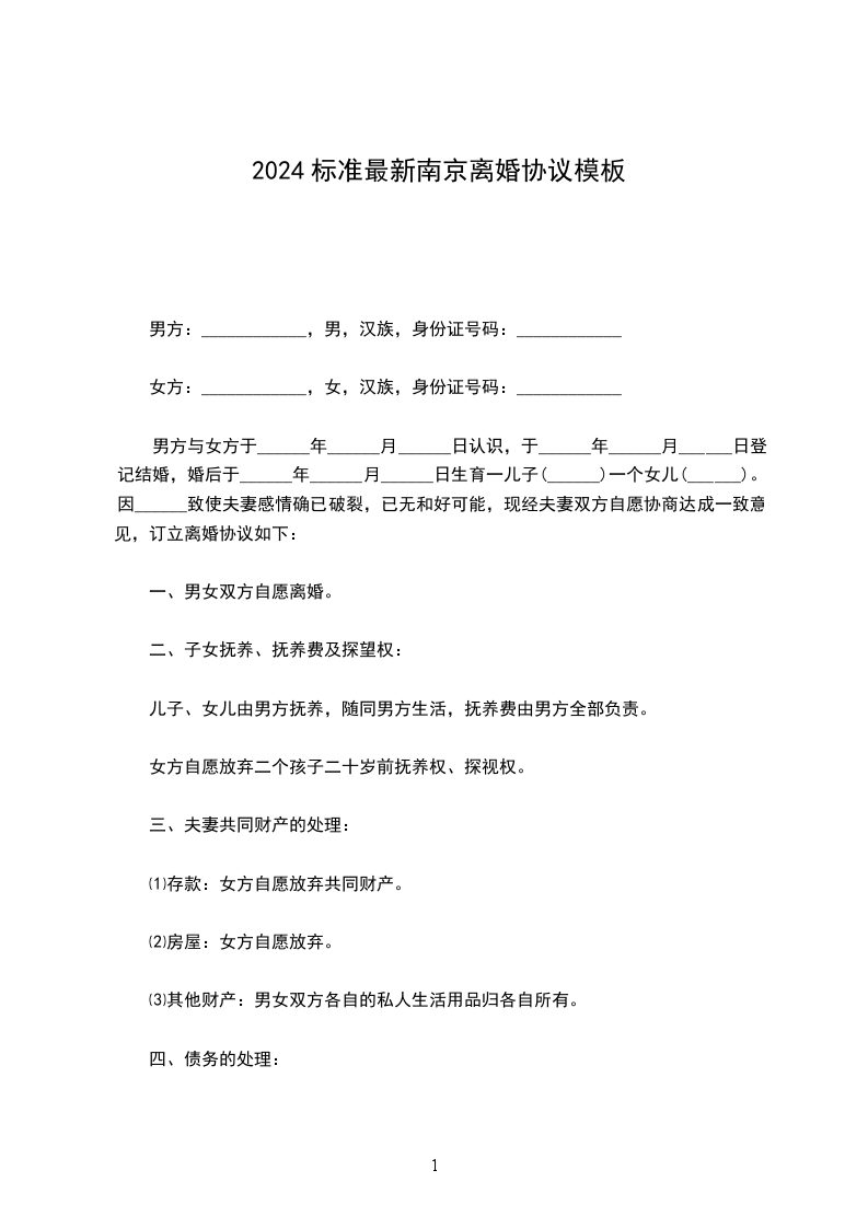 女方:_________________,_______族,_______年_______月_______日出生,现住:_________________,身份证号:_________________;