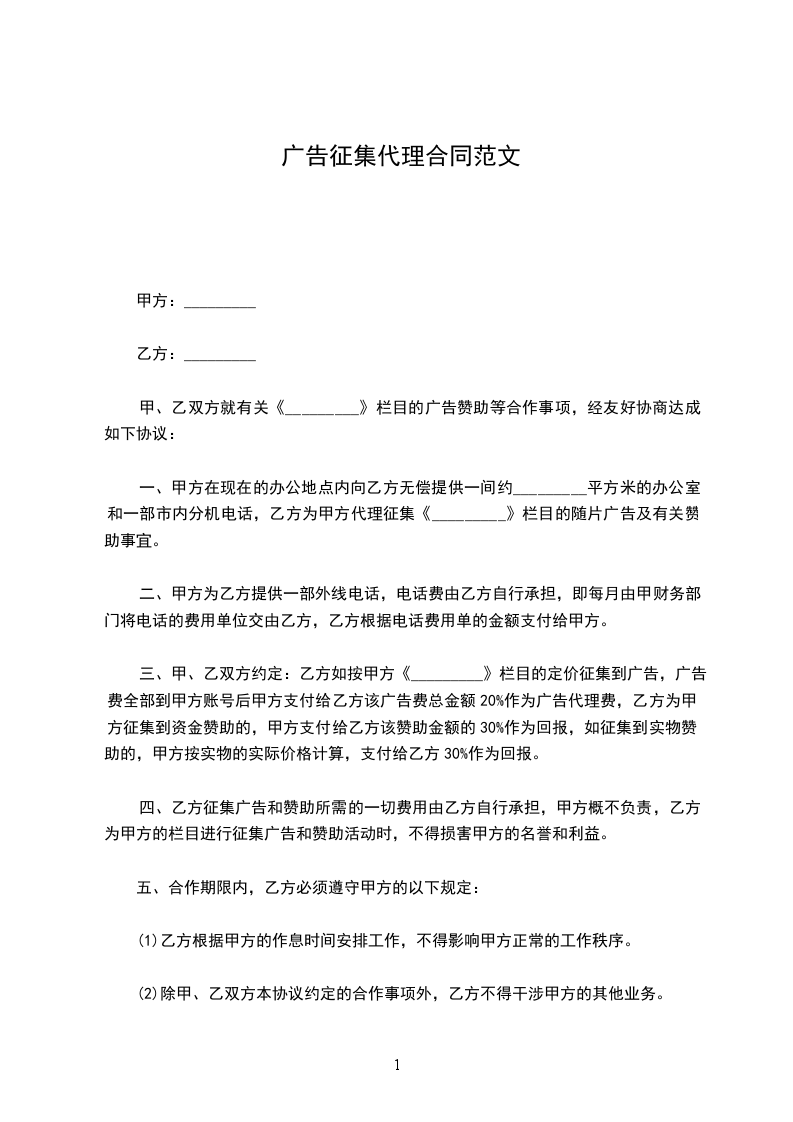 一、甲方在现在的办公地点内向乙方无偿提供一间约_________平方米的办公室和一部市内分机电话,乙方为甲方代理征集《_________》栏目的随片广告及有关赞助事宜。