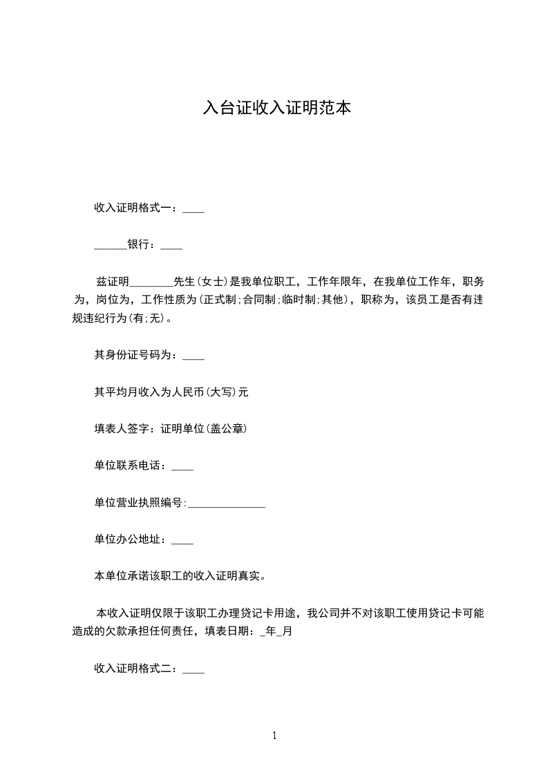 兹证明________________是我公司员工,在________部门任________职务,入台证收入证明。至今为止,一年以来总收入约为__________元。