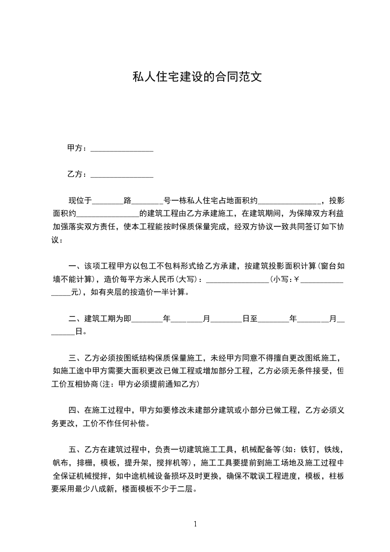 现位于________路________号一栋私人住宅占地面积约________________,投影面积约________________的建筑工程由乙方承建施工,在建筑期间,为保障双方利益,加强落实双方责任,使本工程能按时保质保量完成,经双方协议一致共同签订如下协议: