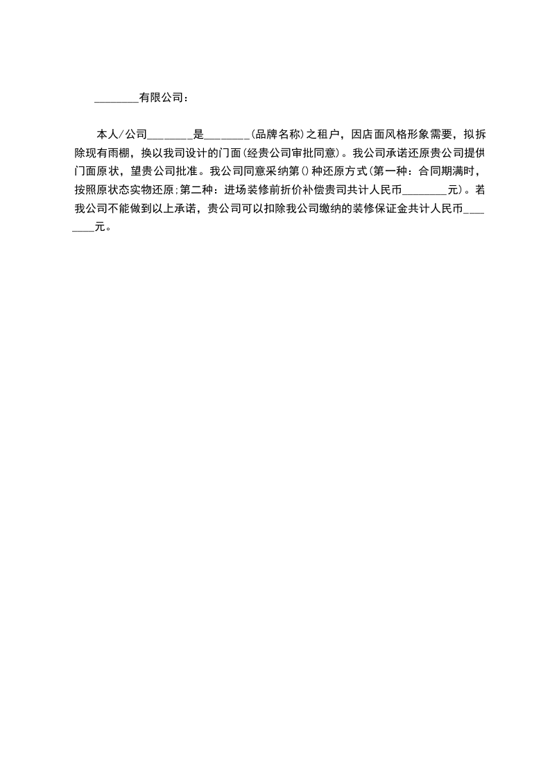本人/公司________是________(品牌名称)之租户,因店面风格形象需要,拟拆除现有雨棚,换以我司设计的门面(经贵公司审批同意)。我公司承诺还原贵公司提供门面原状,望贵公司批准。我公司同意采纳第()种还原方式(第一种:合同期满时,按照原状态实物还原;第二种:进场装修前折价补偿贵司共计人民币________元)。若我公司不能做到以上承诺,贵公司可以扣除我公司缴纳的装修保证金共计人民币________元。