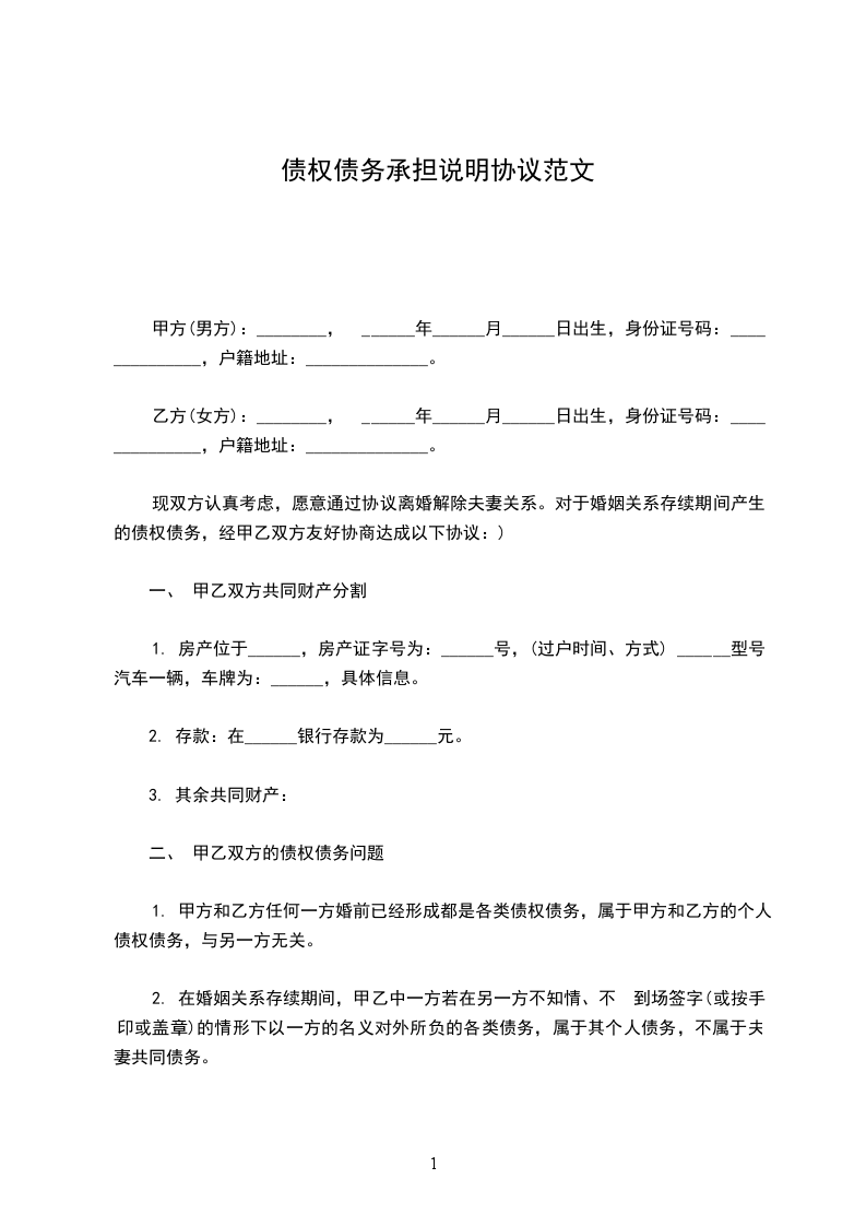 乙方(女方):________, ______年______月______日出生,身份证号码:______________,户籍地址:______________。