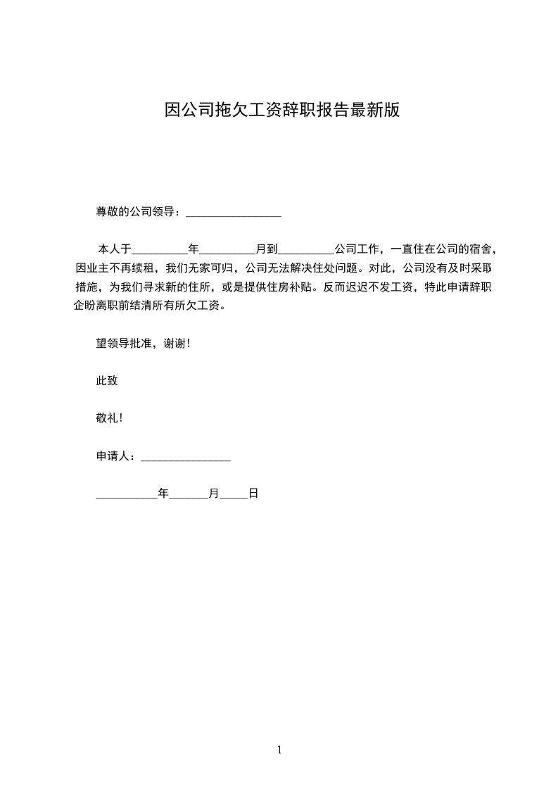 本人于__________年__________月到__________公司工作,一直住在公司的宿舍,因业主不再续租,我们无家可归,公司无法解决住处问题。对此,公司没有及时采取措施,为我们寻求新的住所,或是提供住房补贴。反而迟迟不发工资,特此申请辞职。企盼离职前结清所有所欠工资。