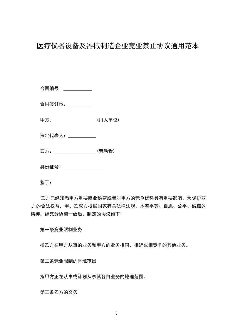 医疗仪器设备及器械制造企业竞业禁止协议通用范本
