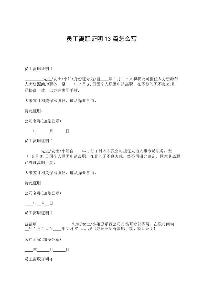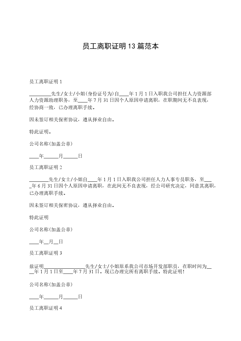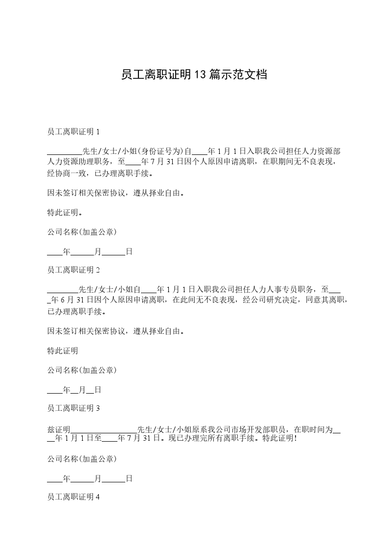 员工离职证明13篇范本