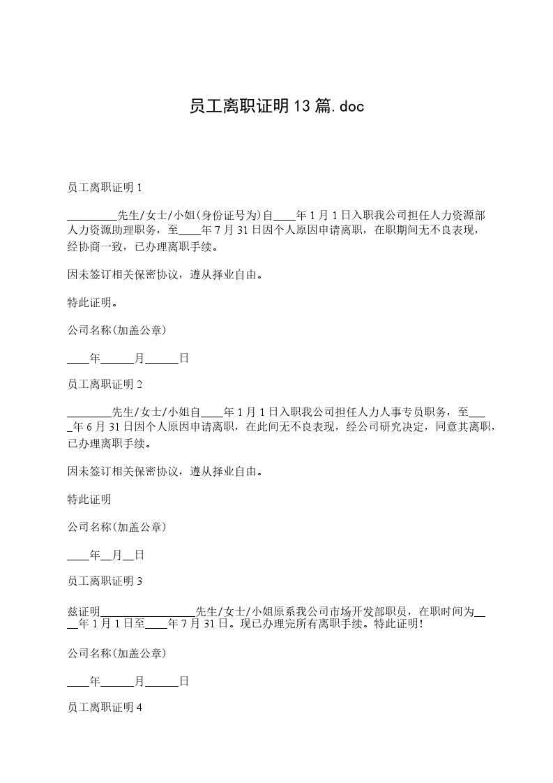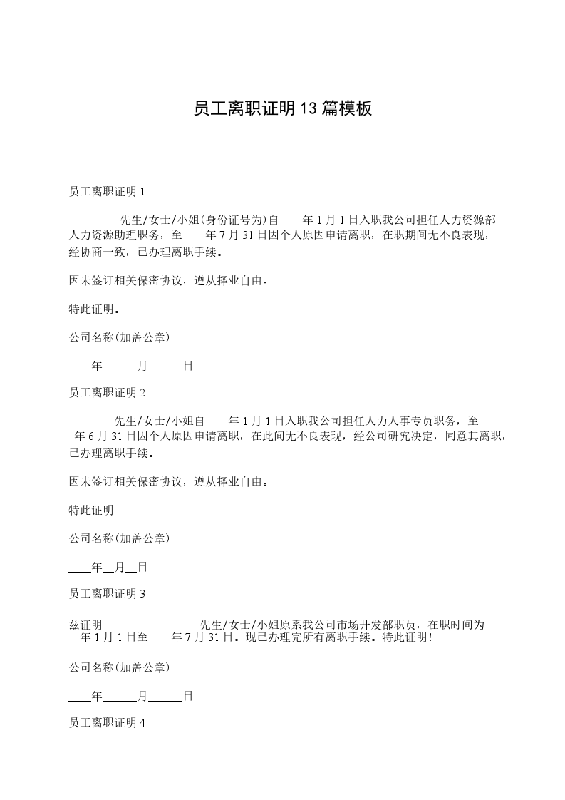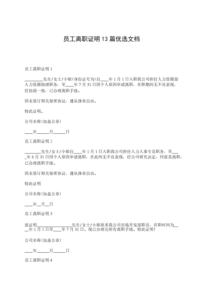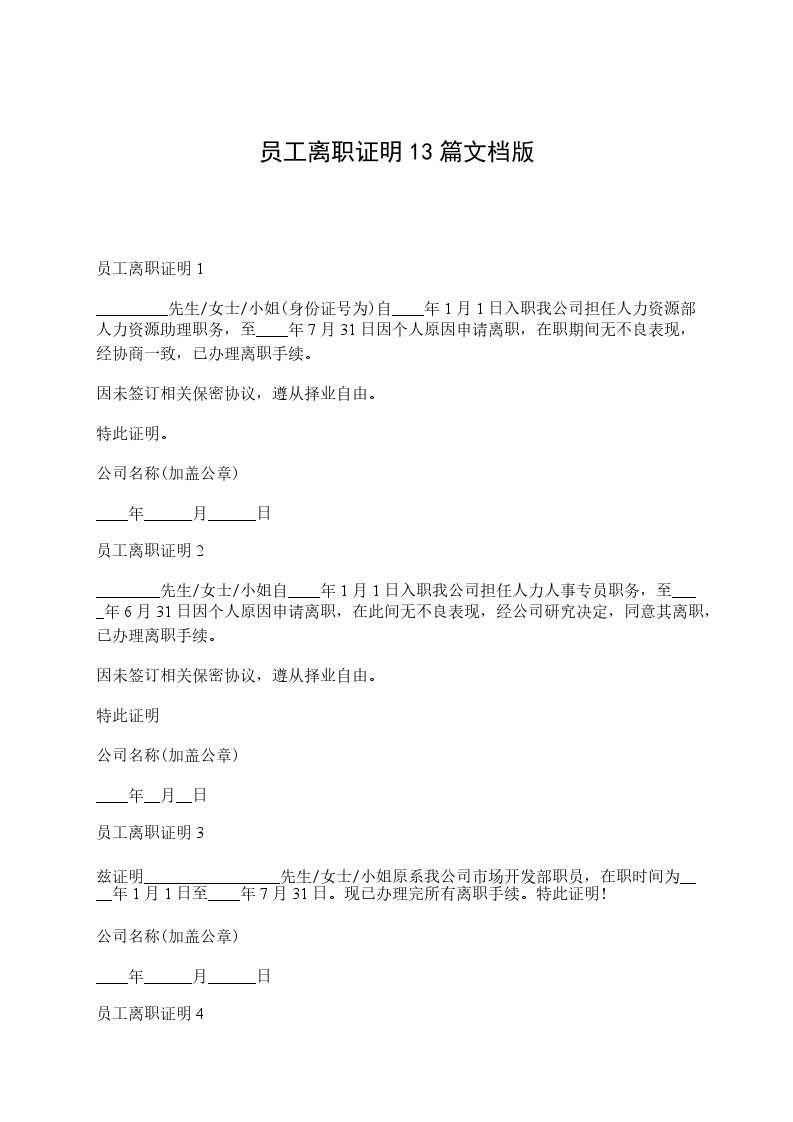员工离职证明13篇范本