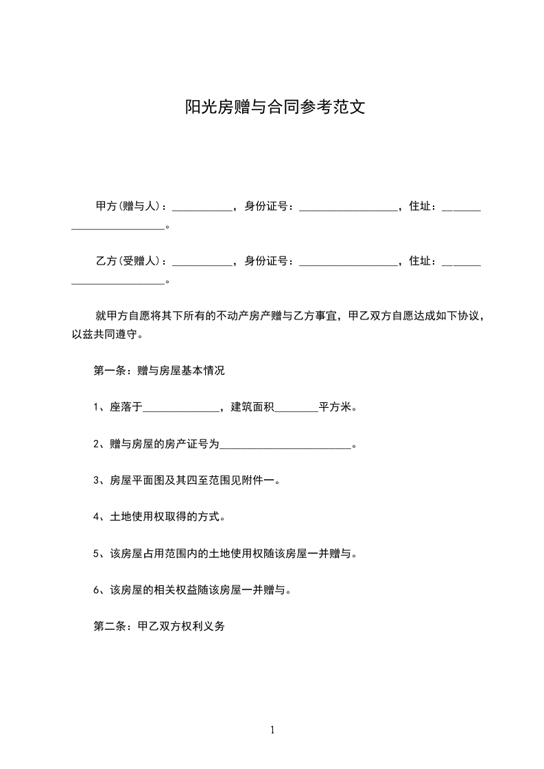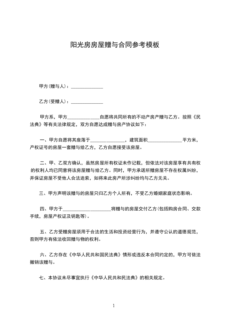 甲方自愿将其下房屋无偿赠与乙方。按照民法典等有关法律规定,双方自愿达成房屋赠与协议如下: