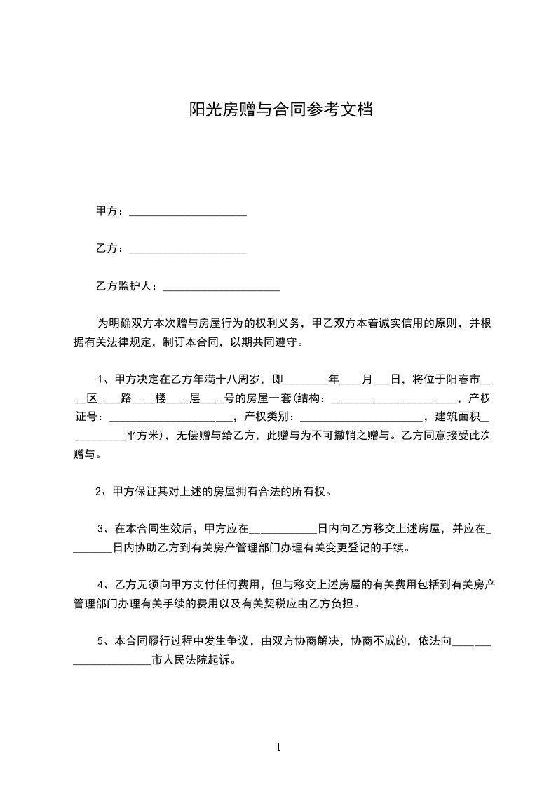 受赠人(以下简称乙方):______________身份证号码:______________________