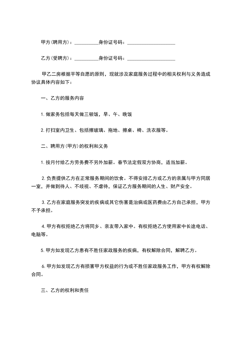 1、甲方有权要求乙方提供做饭、洗衣、打扫卫生以及适当的户外劳动等为内容的家庭服务工作。