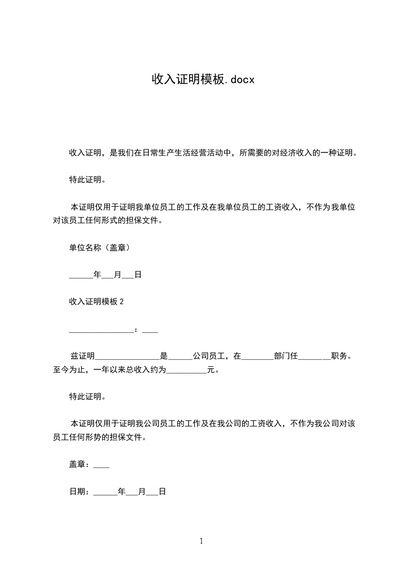 兹证明________________是我公司员工,在________部门任________职务。至今为止,一年以来总收入约为__________元。