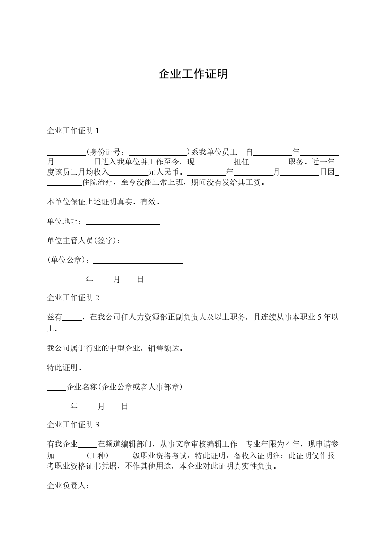 企业工作证明3有我企业_____在频道编辑部门,从事文章审核编辑工作,专业年限为4年,现申请参加________(工种)______级职业资格考试,特此证明,备收入证明注:此证明仅作报考职业资格证书凭据,不作其他用途,本企业对此证明真实性负责。