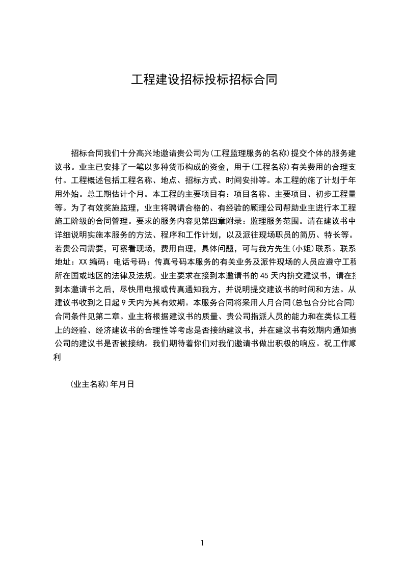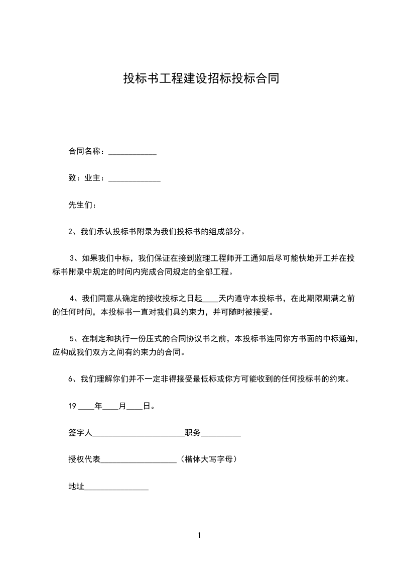 1.根据已收到的招标编号为_______________的_________________工程的招标文件,遵照《工程施工招标投标管理办法》的规定,我单位经考察现场和研究上述工程招标文件的投标须知、合同条件、技术规范、图纸、工程量清单和其他有关文件后,我方愿以人民币_________________元的总价,按上述合同条件、技术规范、图纸、工程量清单的条件承包上述工程的施工、竣工和保修。