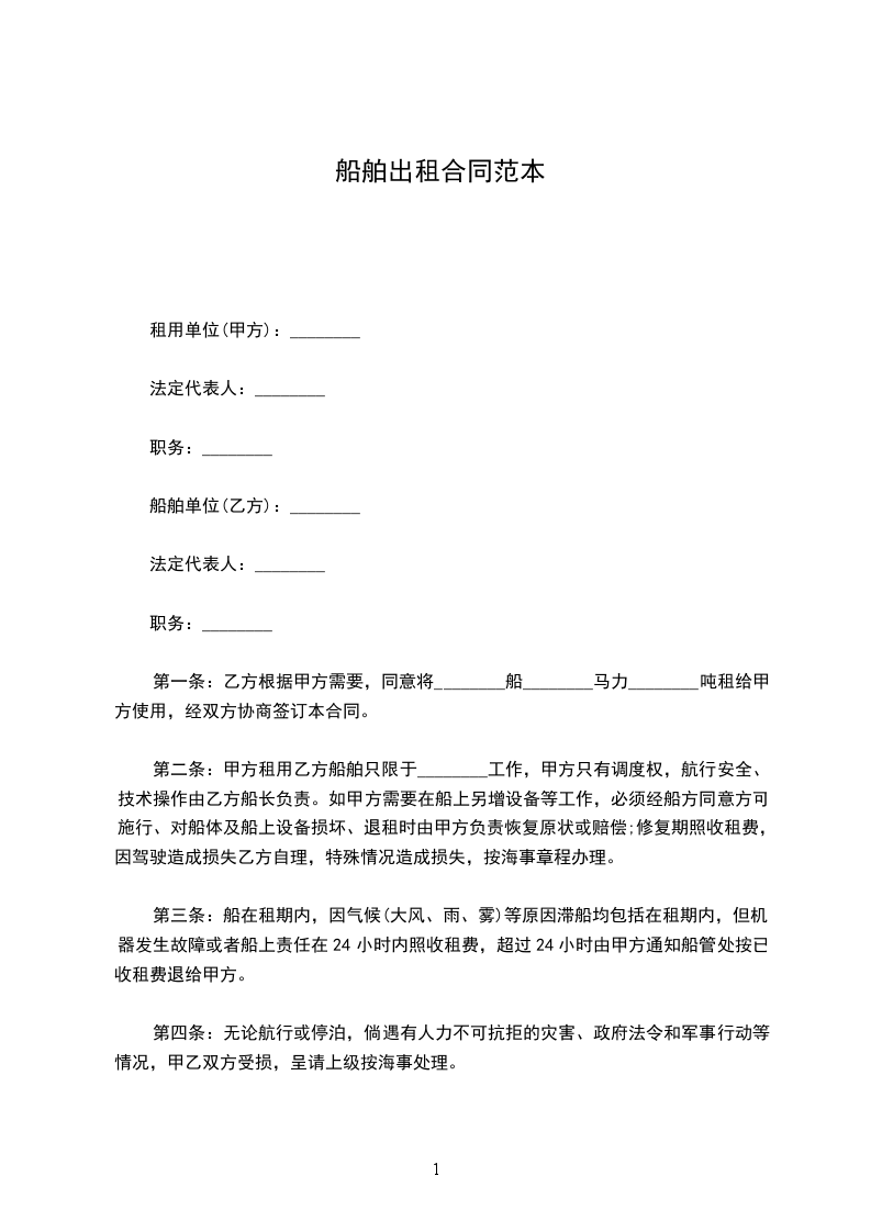 第一条:乙方根据甲方需要,同意将________船________马力________吨租给甲方使用,经双方协商签订本合同。