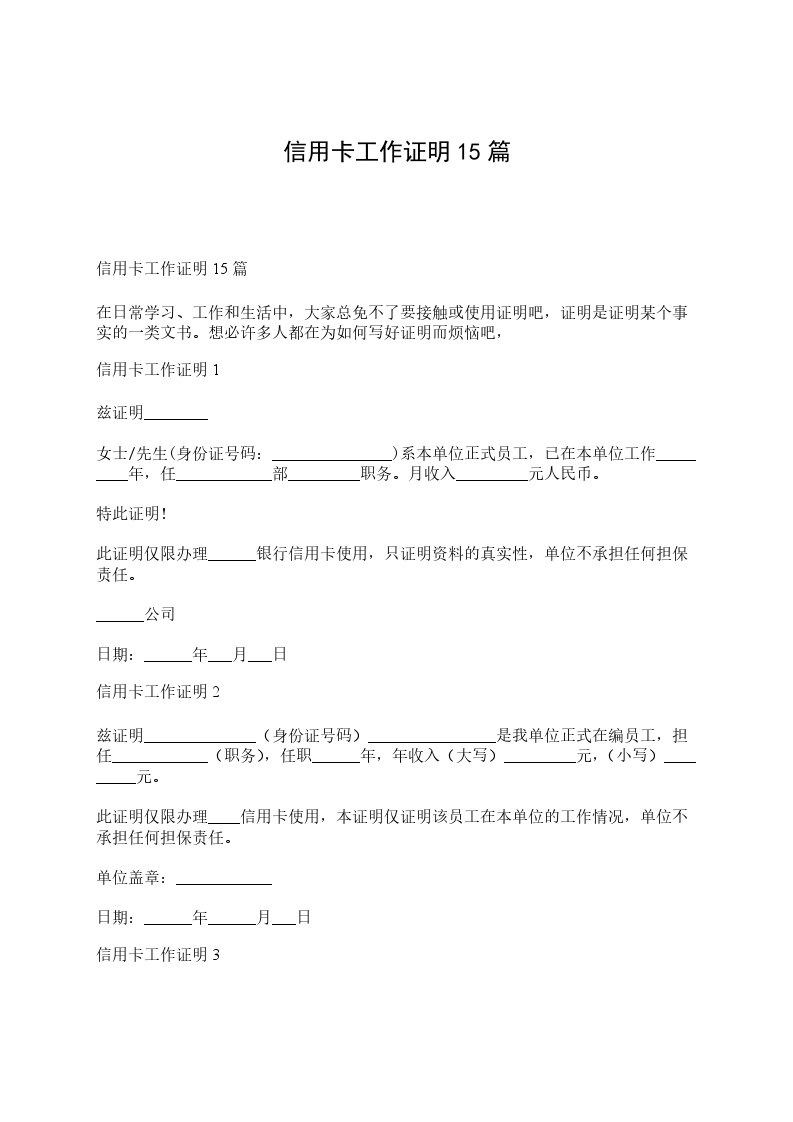 信用卡工作证明15篇