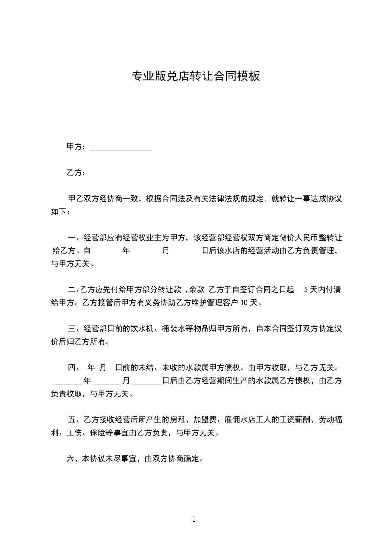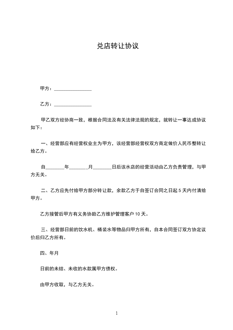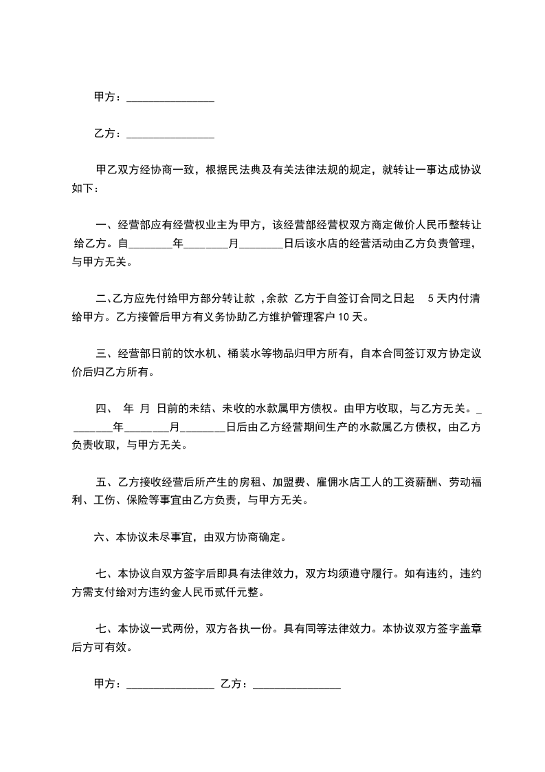 一、经营部应有经营权业主为甲方,该经营部经营权双方商定做价人民币整转让给乙方。自________年________月________日后该水店的经营活动由乙方负责管理,与甲方无关。