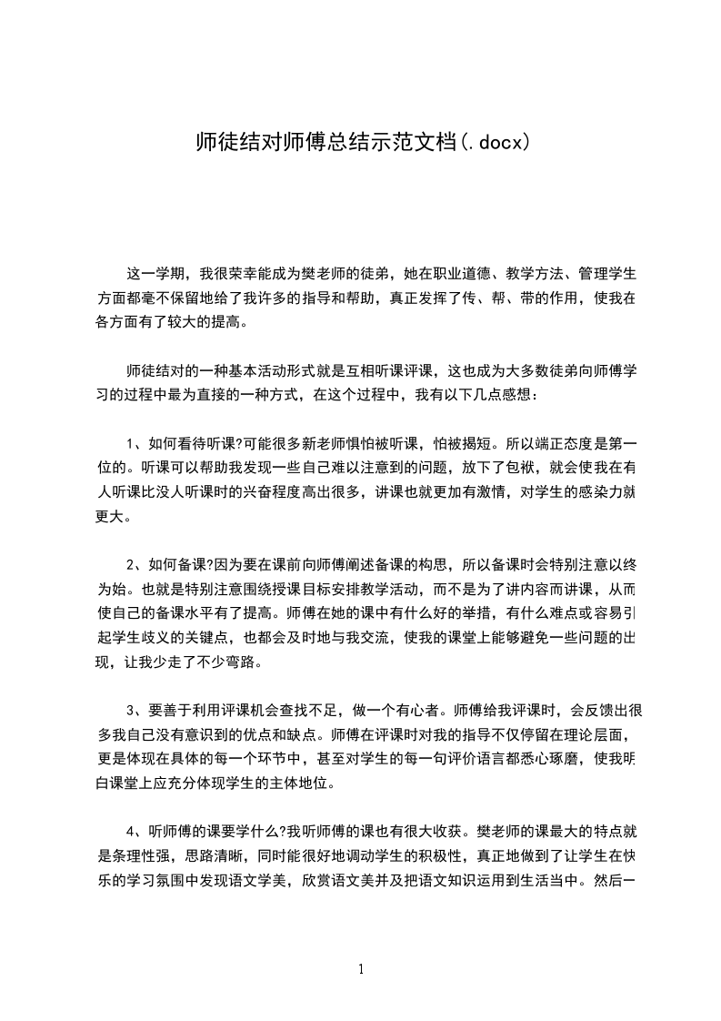 这一学期以来,在樊老师的悉心指导下,在她认真踏实的工作作风的感染下,良好人格品质的熏陶下,我各方面都有了一定的提高。因此我要衷心感谢学校为我提供了这样的机会,衷心感谢樊老师对我的帮助和关心,使我成为师徒结对活动的受益者。