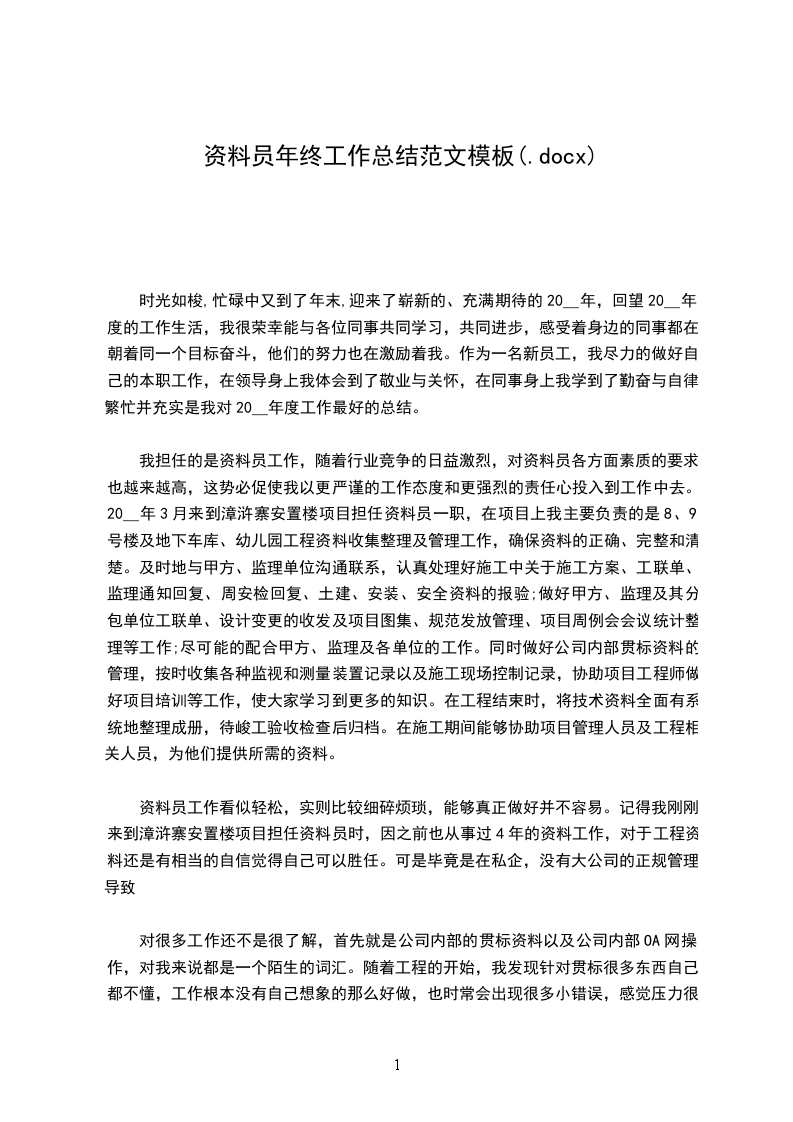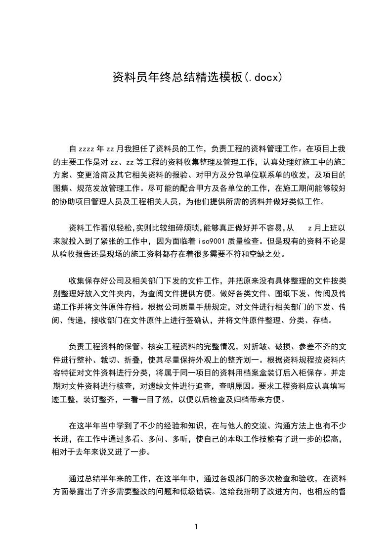 自zzzz年zz月我担任了资料员的工作,负责工程的资料管理工作。在项目上我的主要工作是对zz、zz等工程的资料收集整理及管理工作,认真处理好施工中的施工方案、变更洽商及其它相关资料的报验、对甲方及分包单位联系单的收发,及项目的图集、规范发放管理工作。尽可能的配合甲方及各单位的工作,在施工期间能够较好的协助项目管理人员及工程相关人员,为他们提供所需的资料并做好类似工作。