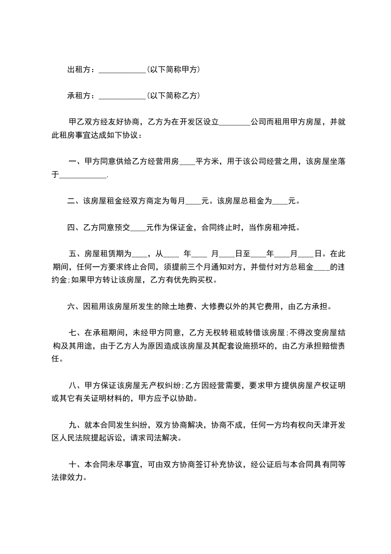 甲乙双方经友好协商,乙方为在开发区设立________公司而租用甲方房屋,并就此租房事宜达成如下协议: